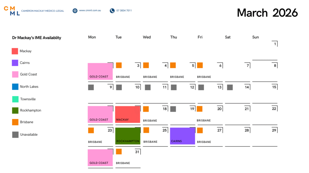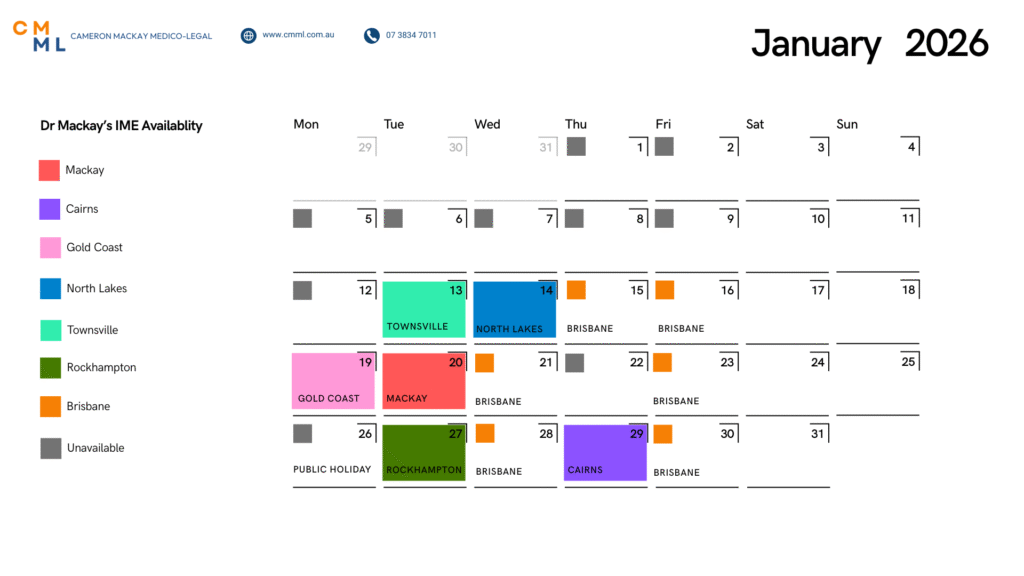 Dr. Cameron Mackay will be continuing medico-legal assessments, independent medical examinations, and permanent impairment assessments into 2026. For ease of bookings and a clearer plan for insurers and legal representatives Dr Mackay will be travelling to regional clinics routinely as well as conducting assessments in Brisbane.