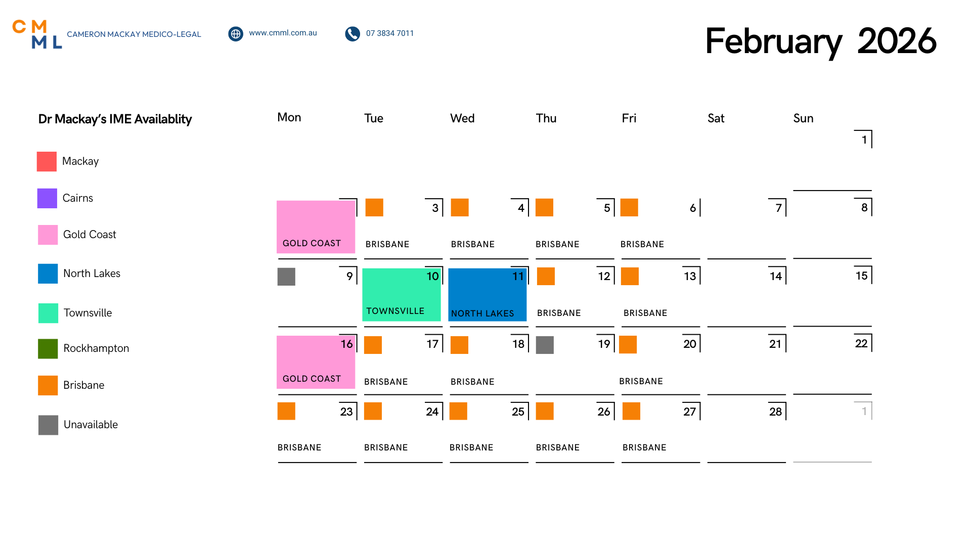 Dr. Cameron Mackay will be continuing medico-legal assessments, independent medical examinations, and permanent impairment assessments into 2026. For ease of bookings and a clearer plan for insurers and legal representatives Dr Mackay will be travelling to regional clinics routinely as well as conducting assessments in Brisbane.